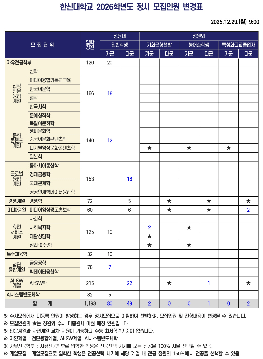 2026Çг⵵ ½ÅÀÔÇÐ Á¤½Ã ¸ðÁý¿ä° ¹× ¸ðÁýÀοø º¯°æÇ¥(¼ö½Ã ÀÌ¿ùÀοø Æ÷ÇÔ)¸¦ °øÁöÇÕ´Ï´Ù.